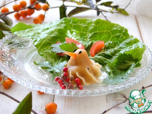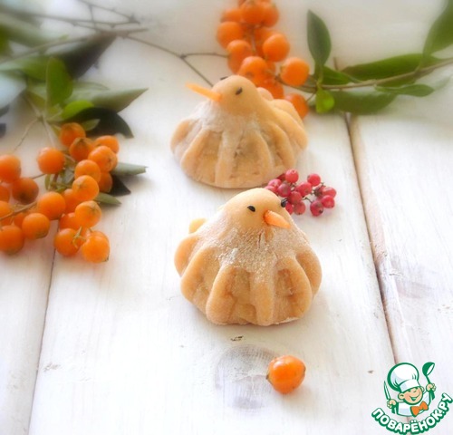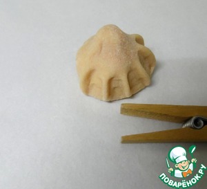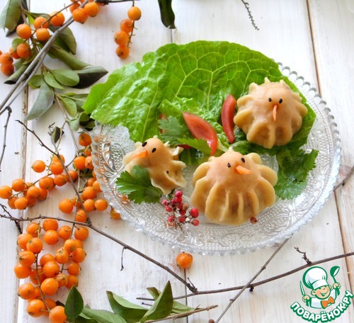 Затем сформировать бока, сделайте это при помощи вот такой прищепки, глаза из чёрного кунжута, клюв из моркови. Приготовить в пароварке.