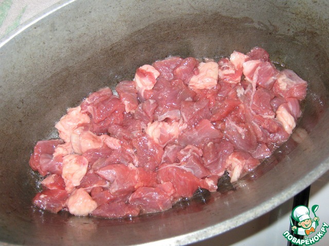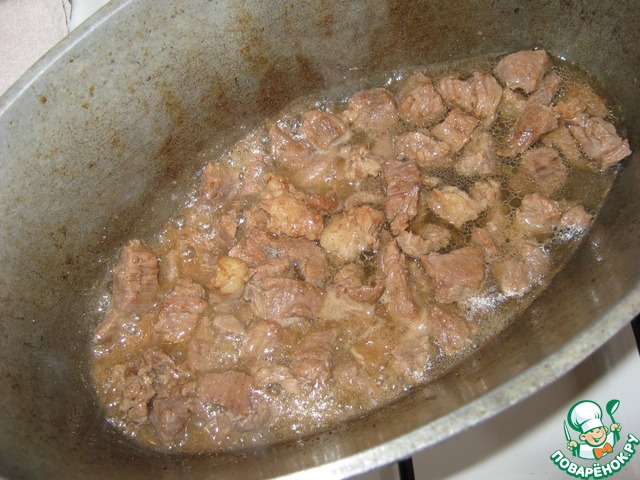 Говядину нарезать кусочками против волокон. На масле, на среднем огне потушить мясо под крышкой.