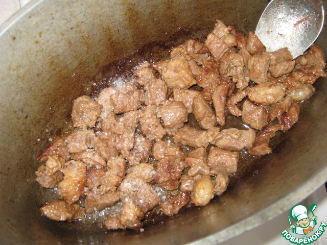 Как только вся влага выкипела, у меня это примерно 10-15 минут, мясо стало "шкворчать" и подрумяниваться, влить воду, чтобы покрыло мясо, накрыть и тушить.