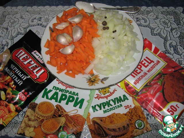 Подготовить специи, сахар, чеснок, морковь нарезать брусочками, лук кубиками.