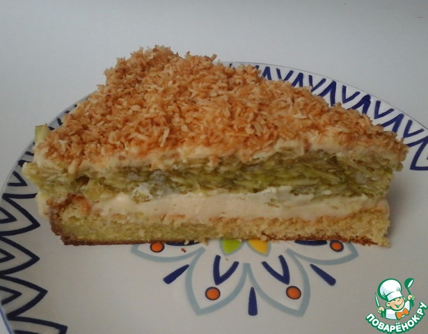 Нежный торт из бисквита, пудингового крема, яблочно-желейного слоя и хрустящей кокосовой стружки.