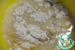 Вливаем эмульсию в муку с сахаром, замешиваем тесто.