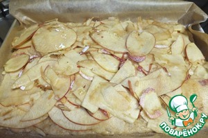 Сверху выкладываем яблоки, посыпаем корицей. Я присыпала яблоки сахарной пудрой с корицей.