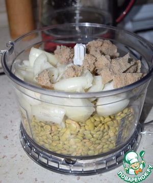 Далее в блендере или в мясорубке измельчим чечевицу с луком и хлебным мякишем.