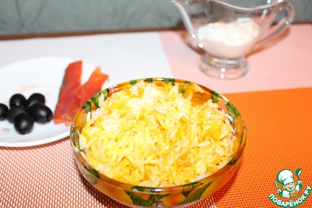 Рис Индика от "Мистраля" варим с добавлением соли до полуготовности и смешиваем с щепоткой куркумы.
