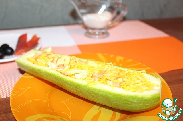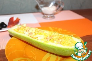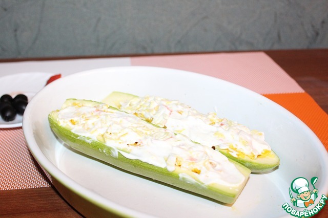 Рис смешиваем с крабовыми палочками и начиняем этим фаршем кабачок.