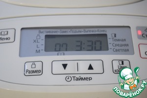 Выбираем режим "Основной хлеб", размер - М (это примерно на 400 г муки), цвет корочки - по желанию. Если в вашей ХП есть режим "Ржаной хлеб", то выбираем его.
