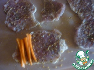 Морковь нарезать на полоски-палочки. На каждый кусок свинины положить несколько кусочков моркови, завернуть и уложить в жаропрочную ёмкость.