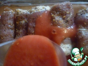 Томаты в собственном соку взбить вместе с соком и залить наши рулетики.