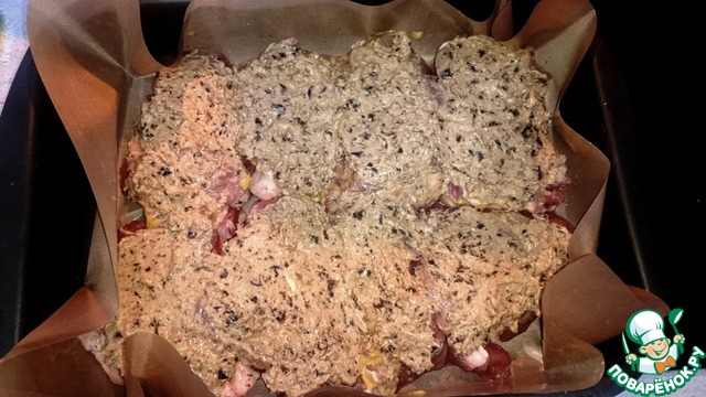 На противень капнуть подсолнечным маслом без запаха ( у меня есть замечательная многоразовая бумага), выкладываем наши эскалопы, каждый из них промазать горчицей (не очень много, но чтоб была!) Ну и сверху укладываем смесь из чернослива и орехов не жадничая.
