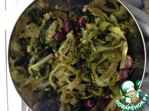 Когда скарола готова, добавляем мелко рубленный чеснок, немного оливкового масла, каперсы, оливки, перчим и солим по вкусу и тушить ещё пару минут.