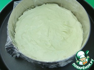Подготовить форму или разъемное кольцо для торта диаметром 18 см, проложив и обернув пищевой пленкой.