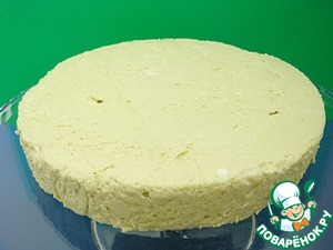 Сверху выложить бисквитный корж и слегка "притопить" его. Поставить в холодильник на три-четыре часа до застывания суфле.
