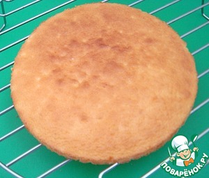 Испечь корж в разогретой до 180 градусов духовке в течении 10 минут и сразу перевернуть форму вверх дном, установить на решетку.