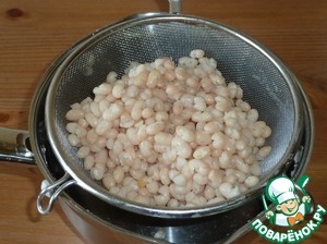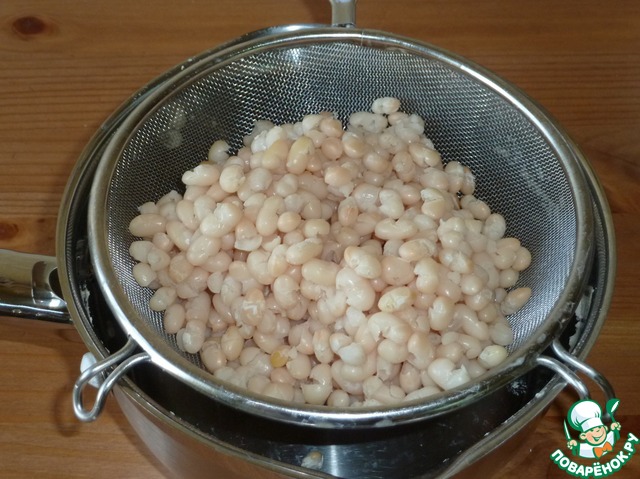 Сваренную фасоль откинуть на сито, дать воде стечь и охладить.