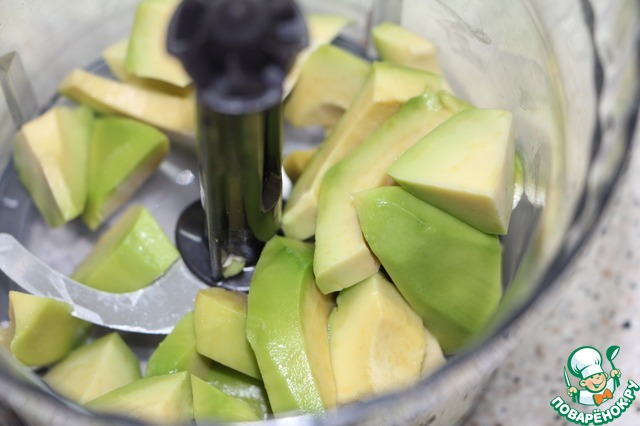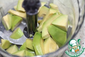 Авокадо почистить, удалить косточку, мякоть порезать кусочками и пробить в блендере до состояния крема.