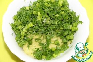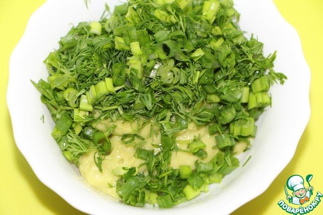 В крем-авокадо добавить рубленный мелко зеленый лук и укроп. Присолить, добавить черный свежесмолотый перец, перемешать.