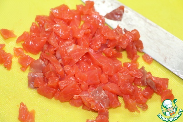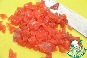 Порезать кубиками по отдельности огурец, помидор и слабосоленую форель.