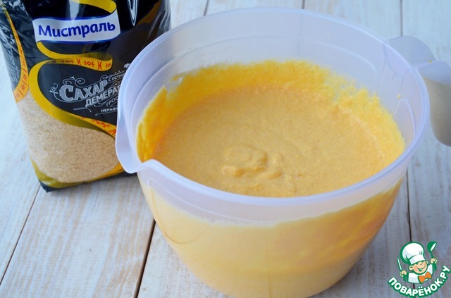 Творог, сахар, мякоть тыквы и апельсиновую цедру очень тщательно пробить блендером до однородности, добавить яйца, крахмал, сок апельсина и венчиком хорошенько перемешать массу. Сахар добавлять по вкусу.