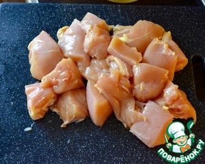 Подготовить куриную грудку; вымыть и нарезать небольшими кусочками, слегка обвалять в муке. Удалить излишки муки.