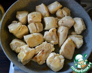 В глубокой сковороде разогреть оливковое масло и слегка обжарить кусочки курицы на среднем огне со всех сторон до золотистого цвета.