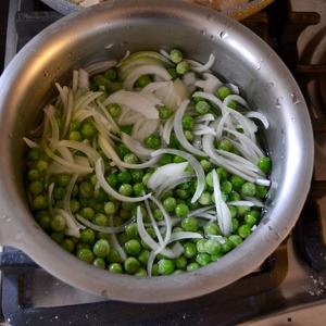 Тем временем луковицу нарезать, положить её в небольшую кастрюльку с горошком (количество горошка можете регулировать по своему вкусу), залить водой так, чтобы она была вровень с горошком и поставить на огонь. Дать закипеть и варить на среднем огне пока обжаривается курица (минут 7-10). Немного посолить.