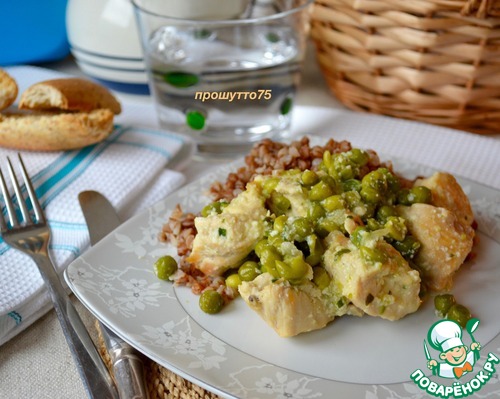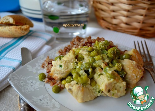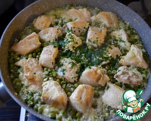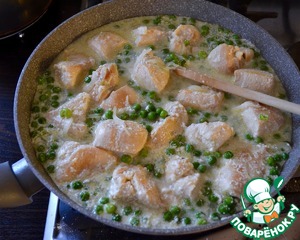 К этому времени горошек немного сварится и количество жидкости в кастрюле уменьшится. Как только молоко в сковороде с курицей немного уварится и загустеет, добавить в сковороду горошек со всей оставшейся жидкостью. Еще немного посолить по вкусу.