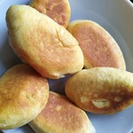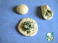 Раскатать шарики в лепёшки, разложить начинку, защипать. Вначале залепить серединку, затем края. Так получаются пузатые пирожки. Начинка по Госту 20-25 г. |