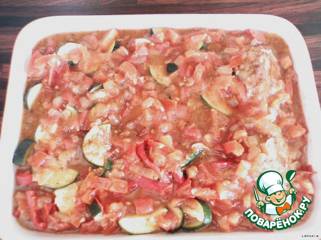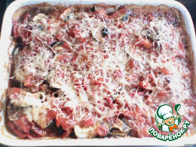 • Теперь залить готовым соусом и запекать в хорошо нагретой в духовке примерно 30 минут при 200С.