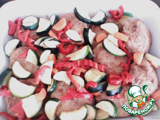 • Тонко нарезанный кабачок, морковь, нарезанный соломкой болгарский перец уложить на тефтели.