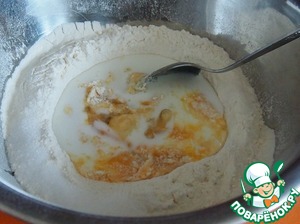 В миске смешать муку, остальной сахар, соль, яйца, остальное молоко, подошедшие дрожжи. Размешать, добавить подсолнечное масло, оставив одну ложку для смазывания.