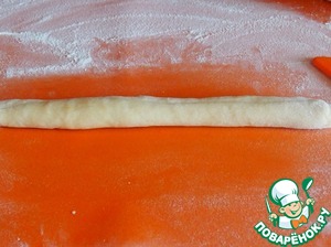 Через 20 минут тесто поделить на несколько частей, из каждой части скатать валик диаметром 1,5 - 2 см. и длиной, равной ширине противня. Противень застелить бумагой для выпечки, бумагу слегка смазать маслом.
