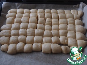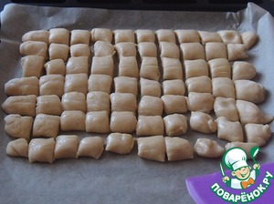 Разложить валики теста на расстоянии 1 см друг от друга. Ножом или другим приспособлением разрезать эти валики поперек сверху вниз через весь противень на кусочки размером примерно 1,5 см.
