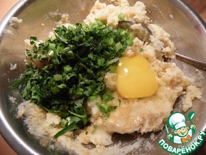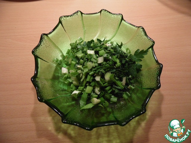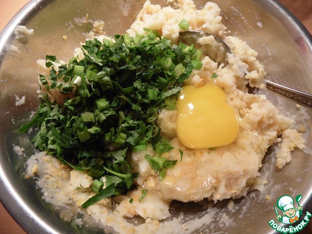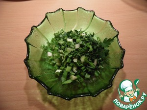• В полученную смесь добавить нашинкованные петрушку и лук, добавить яйцо, все хорошо вымесить.