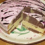 Приготовить крем для украшения. Взбить охлажденные сливки с сахаром в крепкую пену. В конце добавить размороженные ягоды черной смородины, слегка размятые.