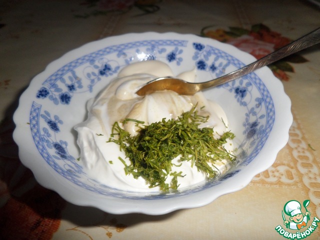 В чашке готовим соус из сметаны, майонеза, горчицы и мелконарезанного укропа.