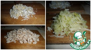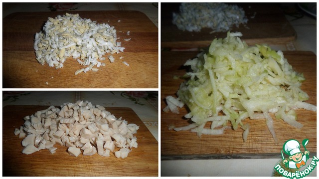 Кальмара нарезаем мелким кубиком, отварные яйца трем на терке, яблоко также трем на терке. Грибы откидываем на дуршлаг.