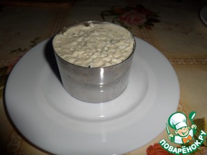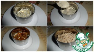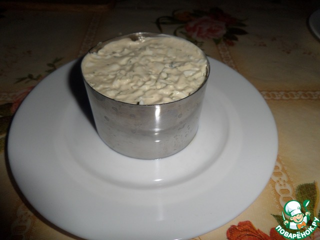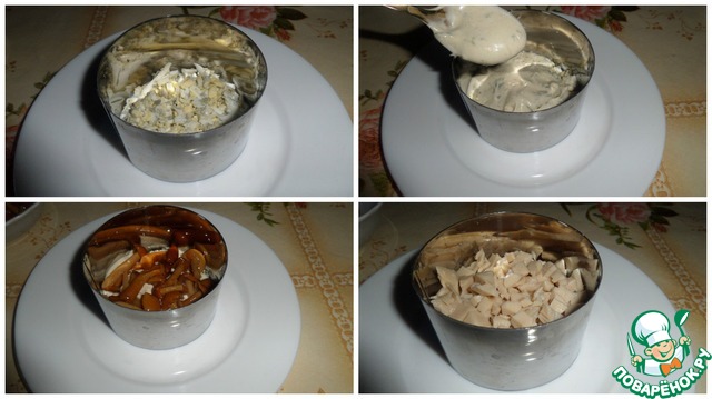 На тарелку ставим кольцо и слоями выкладываем салат : яйца - соус - грибы - кальмар.