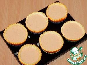 9. Половинки (кожуру) апельсина кладем для устойчивости в формочку для кексов и заливаем сырной массой. 8 ст. л. сырной массы оставляем. Ставим формочки в морозилку на 1-2 часа.