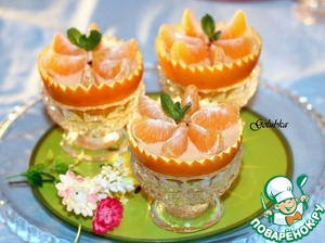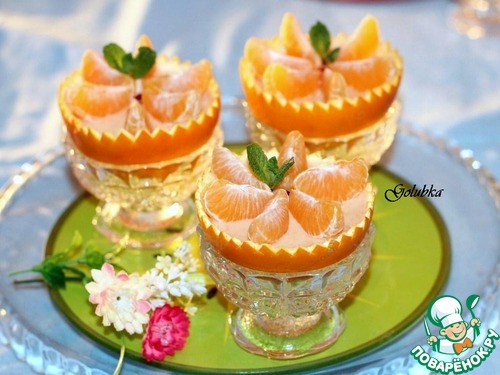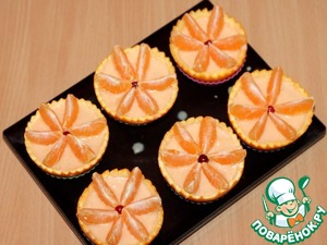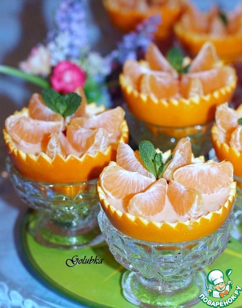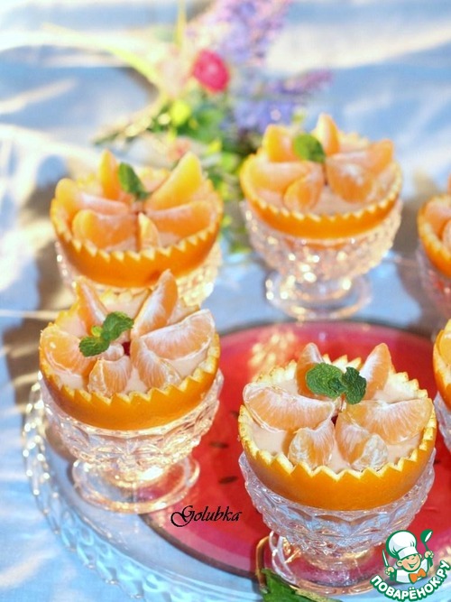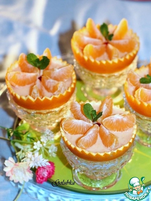 На сырную массу кладем дольки мандарина и украшаем листочком мяты.