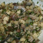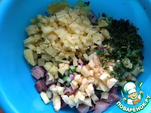 Мелким кубиком нарезать огурец и лук, филе сельди чуть более крупным кубиком.