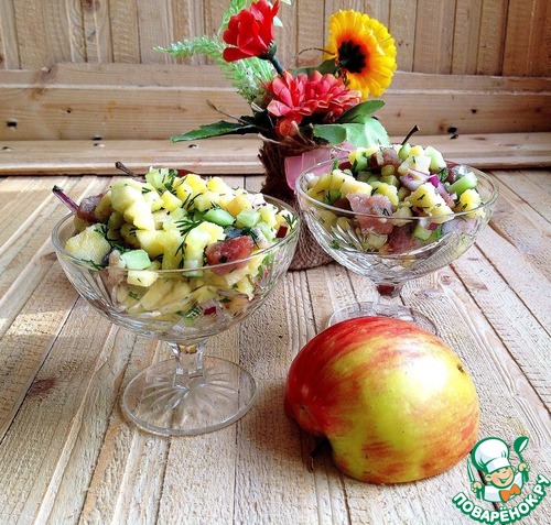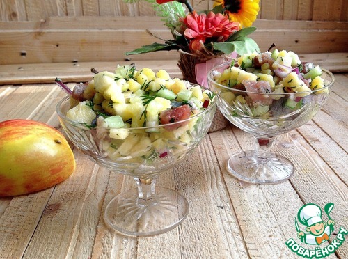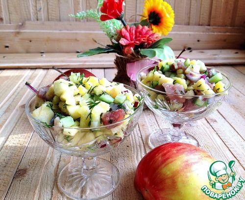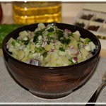 Картофель и яблоко очистить от кожуры и нарезать мелким кубиком, укроп измельчить. Салат заправить маринадом, перемешать и дать ему настояться в холодильнике около часа.