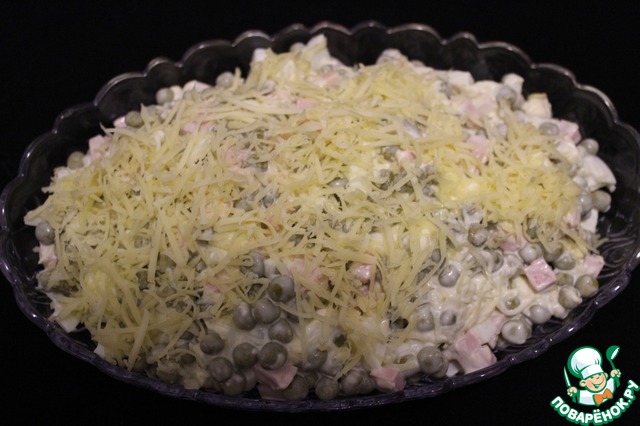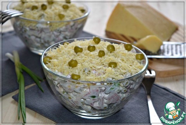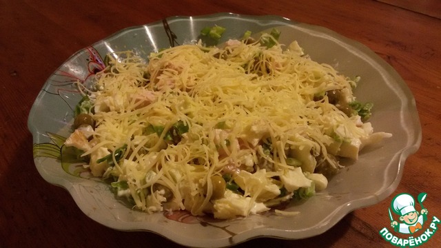 ... с двух сторон. Яичный блин получается пышным и хорошо переворачивается. Остывший блин нарезать соломкой и добавить к салату. Аккуратно перемешать салат. Сверху украсить сыром натертым на мелкой терке.