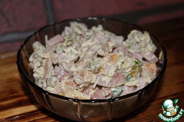 Колбасные изделия нарезать маленьким кубиком, добавить майонез. Колбасно-копченые изделия можете брать на свой вкус. Вкусно будет и с колбасой п/к, и пробовала с карбонатом, но должно быть не менее 3 видов колбасных изделий. -