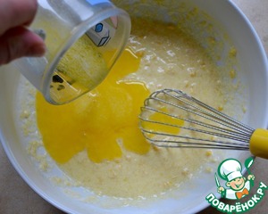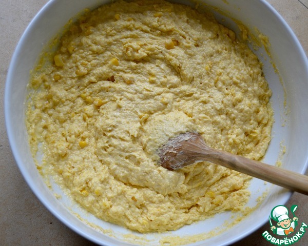 Выложить полученную из кукурузы "кашицу" в объемную миску и добавить сахар, йогурт, молоко и сок лимона. Как следует все перемешать.