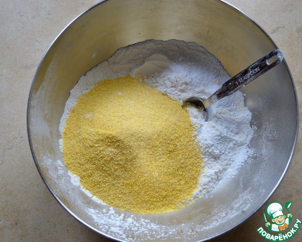 Оба вида муки смешать с разрыхлителем, содой и солью.
