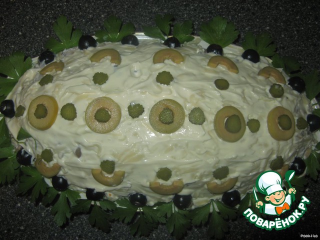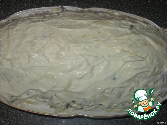 Слоеный салатик с малосольной селедочкой , грибами и маринованными огурчиками. Очень сочный и вкусный!!!