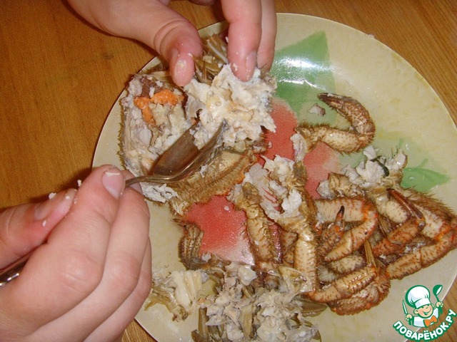Чистятся лапки и клешни. Мясо из них, тоже нужно положить в панцирь.