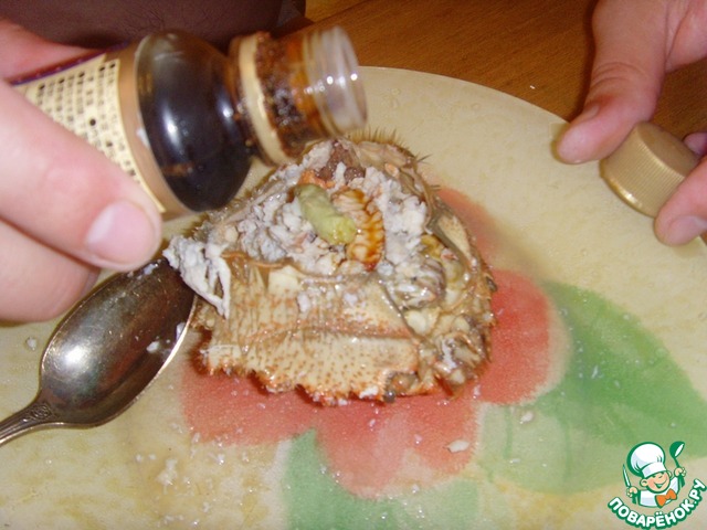 С нижней части панциря ложкой счищается всё мясо и жир. Это всё добавляется к печени.