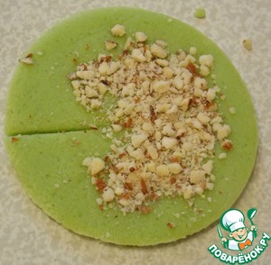 Затем на каждом сделать надрез от центра к раю. Вдавить по кругу орехи тонким слоем.